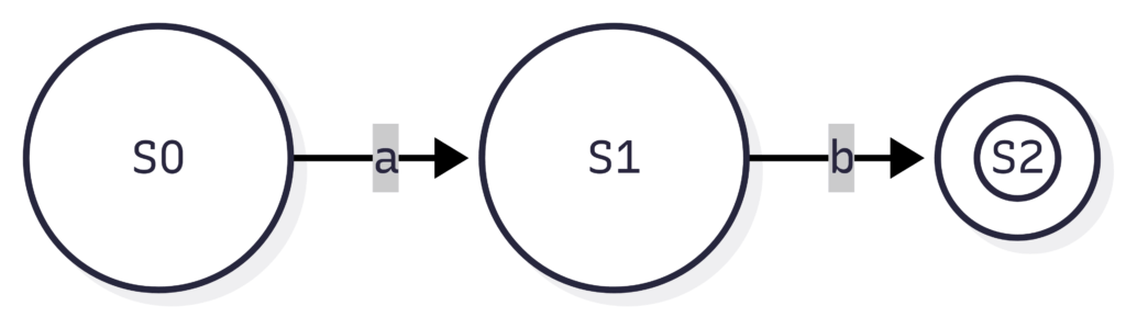 S0から入力aが来るとS1に遷移 S1でbが入力されるとS2(受理状態)に遷移S2に到達すると入力文字列は受理される